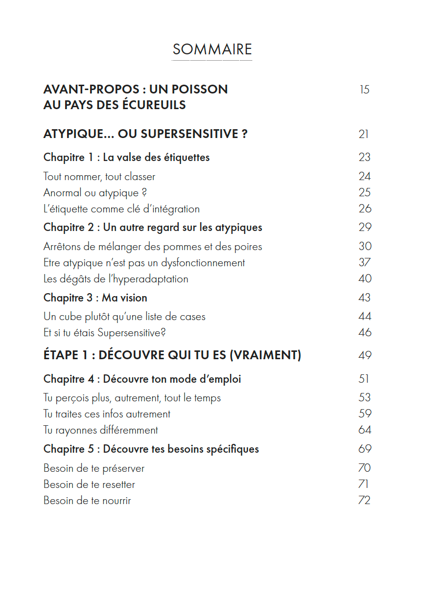 Dans ce que j'ai appelé l'Étape 0, je te partage une série de réflexions sur les notions de normalité et d’atypisme, avec tous les pièges, mythes et autres confusions qui entourent ces concepts et la valse des étiquettes qui l’accompagne. Je t’y présente aussi ma vision de ce que j’ai choisi d’appeler la Supersensitivité.