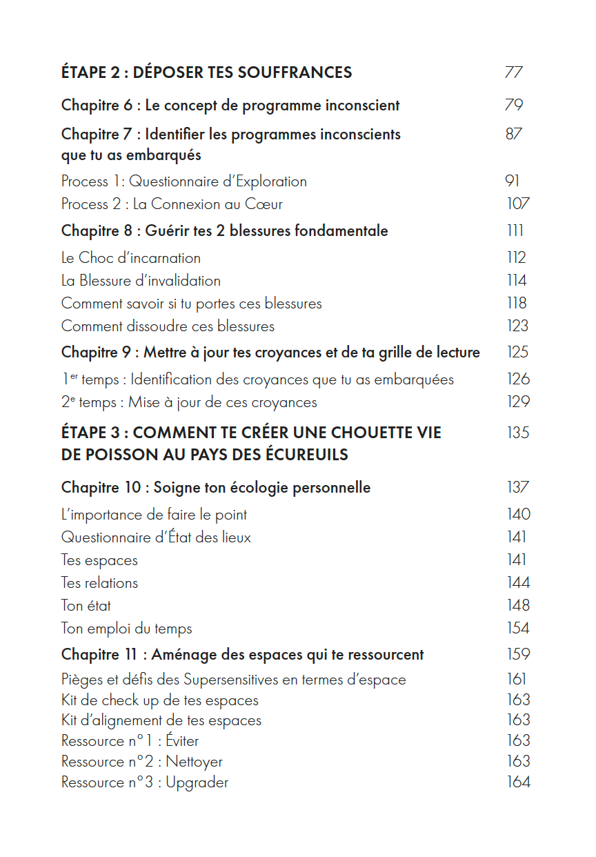 Dans l'Étape (Comment te créer une chouette vie de Poisson) je t’expliquerai les clés essentielles pour adapter tes choix de vie à ton mode d’emploi du Supersensitive. Tu y trouveras plein de ressources pratiques pour aligner tes espaces, tes relations, ton état et ton emploi du temps.